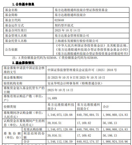 | 基金募集申请获中国证监会核 | | 中国证券监督管理委员会证监许可(2025)2018号 | | | | --- | --- | --- | --- | --- | | 准的文号 | | | | | | 平等意重期回 | | 自 2025年10月9日至2025年10月10日 | | | | 验资机构名称 | | 安永华明会计师事务所(特殊普通合伙) | | | | 募集资金划入基金托管专户的 | | 2025年10月14日 | | | | 日期 | | | | | | 募集有效认购总户数(单位: | | 14. 689 | | | | 户) | | | | | | 份额类别 | | 易方达港股通科技 | 易方达港股通科 | 合计 | | | | 混合 A | 技混合C | | | 墓集期间净认购金额(单位: | | 1. 346. 073. 120. 08 | 640. 795. 004. 75 | 1. 986, 868, 124, 83 | | 人民币元) | | | | | | 认购资金在募集期间产生的利 | | 39. 016. 51 | 17. 169. 62 | 56. 186. 13 | | ...