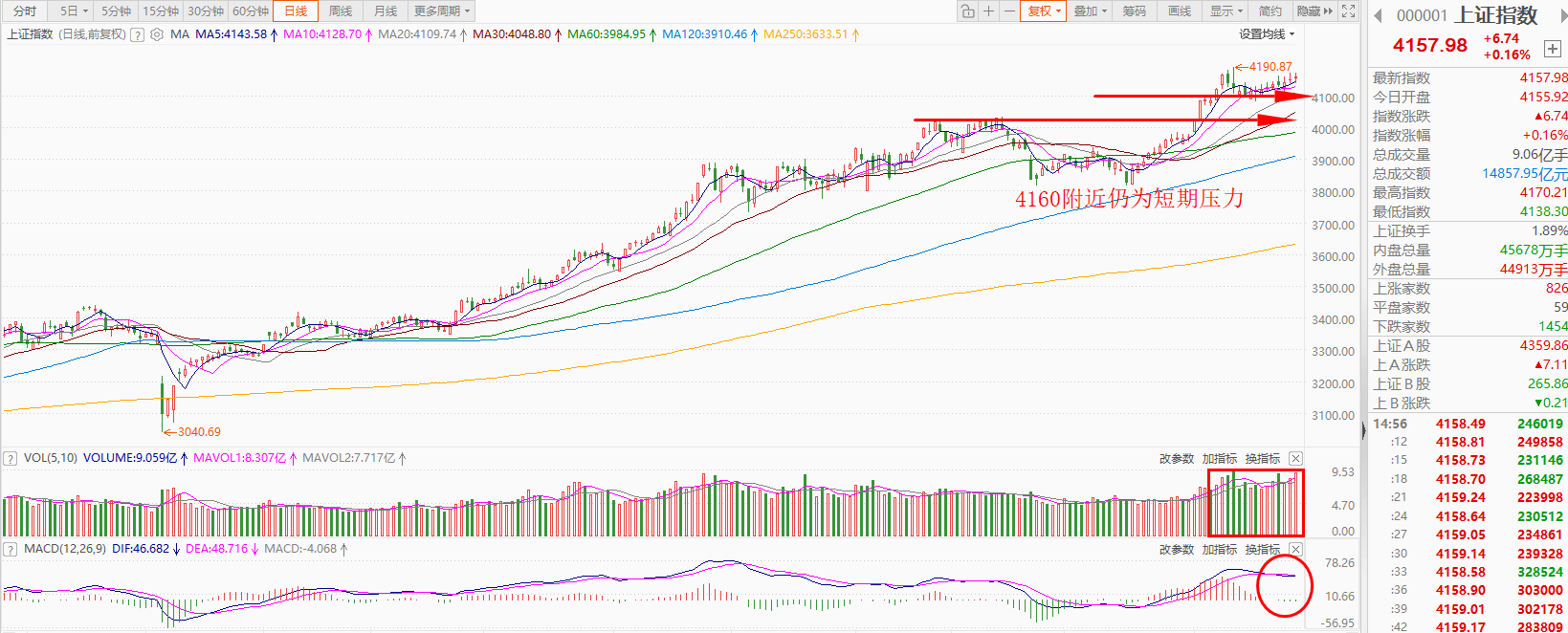 亚商投顾熊舞老师提醒大家:股市有风险,投资需要多加小心,避免不必要的风险。 一、大盘 1.盘面 上证指数早盘小幅高开,随后窄幅震荡,午后再度小幅震荡,截止收盘,指数上涨0.16%,收出十字线,全天成交额1.49万亿,相比上交易日的1.37万亿, 增加了1200亿。 深证成指早盘小幅低开,随后冲高回落,午后低位震荡,截止收盘,指数下跌0.30%,收出十字线,全天成交额1.74万亿,相比上交易日的1.60万亿,增加 了1400亿。 2.技术分析 图片来源:东方财富 上证指数今日依旧小幅震荡,沿着5日线稳健攀升,整体来看趋势仍属多头主导的温和上行格局;不过从分时图上可清晰观察到黄白线午后再度背离,指数 虽稳如泰山,但个股似乎并没那么乐观,跌多涨少格局再度凸显,赚钱效应持续萎缩,所以近几日大家的体感并不好,多数个股并不跟随指数上涨,反而出 现"赚指数不赚钱"现象。且最近"权重"与"题材"形成了跷跷板效应,资金在权重蓝筹与题材成长之间快速腾挪,导致二者此消彼长、节奏错位;所以操作上 务必严守"高低切换"纪律,避免追高已兑现品种,优先关注低位启动、量价配合良好、且具备业绩支撑的科技细分龙头。 深证成指今日窄幅震荡,小幅收 ...