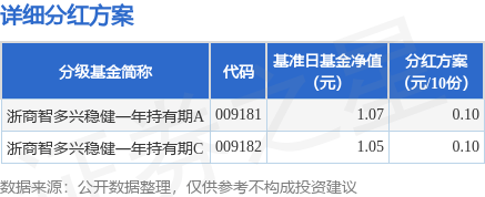 | 分级基金简称 代码 | 墓准日基金净值 分红方案 | | | --- | --- | --- | | | (元) | (元/10份) | | 浙商智多兴稳健-年持有期A 009181 | 1.07 | 0.10 | | 浙商智多兴稳健一年持有期C 009182 | 1.05 | 0.10 | 证券之星消息,11月18日发布《浙商智多兴稳健回报一年持有期混合型证券投资基金分红公告》。2025 年度收益的第1次分红。公告显示,本次分红的收益分配基准日为11月11日,详细分红方案如下: 本次分红对象为权益登记日登记在册的本基金份额持有人,权益登记日为11月20日,现金红利发放日为 11月24日。选择红利再投资方式的投资者所转换的基金份额将以2025年11月20日除息后的基金份额净值 为计算基准确定再投资份额,红利再投资所转换的基金份额于2025年11月21日直接划入其基金账户, 2025年11月24日起投资者可以查询。根据财政部、国家税务总局相关规定,基金向投资者分配的基金收 益,暂免征收所得税。本基金本次分红免收分红手续费。选择红利再投资方式的投资者其红利所转换的 基金份额免收申购费用。 以上内容为证券之星据 ...