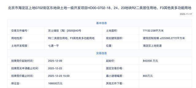 北京进深 徐迪 11月17日,海淀上地0702街区地块在预申请3天后正式挂牌。 起始价84.22亿元,将于12月23日下午完成出让。 其中,两幅居住地块:0702-18、24地块起始价分别为33.58亿元、30.96亿元; 23多功能地块起始价为19.69亿元。 竞价阶梯为850万元,竞买保证金16.85亿元。 其中,0702-18地块规划建面4.84万㎡,24地块4.46万㎡,均为居住用地,容积率2.2,限高30米。 0702-23地块为F3其他类多功能用地,占地3.48公顷,规划建筑规模13.23万㎡,容积率3.80,限高36 米。 包含非独立占地设施建筑面积2250㎡: 托老所800㎡,老年活动设施200㎡,社区助残服务中心200㎡,室内体育文化设施700㎡,社区管理服务 用房350㎡; 另含商业服务设施建面约500㎡,公厕1座约70㎡,10千伏开闭站约300㎡,通信机房及10千伏电缆分界 室各1座,建面约50-100㎡。 本次挂牌出让宗地设置竞买资格预审环节,通过海淀区政府资格预审的具有房地产开发资质的企业均可 参加竞买。 | | | | 2025-11-17 | | --- | --- | --- ...