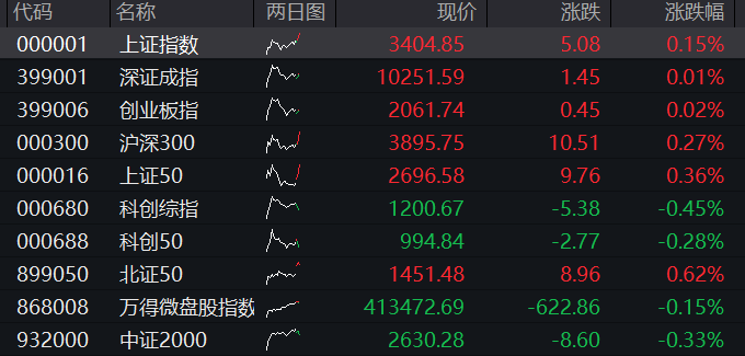 6月10日周二,A股早盘震荡调整,银行股继续走强,带动沪深300指数、上证50指数反弹。港股恒指、恒科指窄幅 震荡,恒科指下跌,生物科技板块继续走强,泡泡玛特再创新高。债市方面,国债期货继续上涨。商品方面,国内 商品期货涨跌不一,焦煤焦炭领跌,铝合金上市首日一度涨超5%。核心市场走势: | 代码 | 名称 | 两日图 | 现价 | 涨跌 | 涨跌幅 | | --- | --- | --- | --- | --- | --- | | 000001 | 上证指数 | | 3404.85 | 5.08 | 0.15% | | 399001 | 深证成指 | 1 m | 10251.59 | 1.45 | 0.01% | | 399006 | 创业板指 | V | 2061.74 | 0.45 | 0.02% | | 000300 | 沪深300 | Mar | 3895.75 | 10.51 | 0.27% | | 000016 | FJF50 | MW! | 2696.58 | 9.76 | 0.36% | | 000680 | 科创综指 | | 1200.67 | -5.38 | -0.45% | | 0006 ...