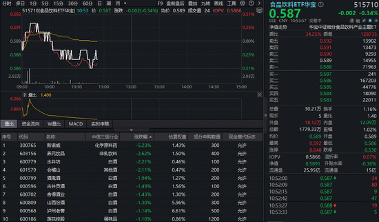 吃喝板块今日(1月15日)继续回调,反映吃喝板块整体走势的食品饮料ETF华宝(515710)开盘短暂拉升后跳水翻绿,截至发稿,场内价格跌0.34%。 成份股方面,白酒跌幅居前。截至发稿,水井坊跌超2%,酒鬼酒、古井贡酒、山西汾酒、泸州老窖等多股跌超1%,拖累板块走势。 | | | 分时 多日 1分 5分 15分 30分 60分 日 周 | | 月 = | | | | F9 盘前盘后 叠加 九转 画线 工具 谷 | 2 | 食品饮料 印度 (0) | | 51571 | | --- | --- | --- | --- | --- | --- | --- | --- | --- | --- | --- | --- | --- | | 0.59 | | | | 515710[食品饮料ETF华宝] 10:53 价 0.587 涨跌 -0.002(-0.34%) 均价 0.589 | | | | 成交量 24 IOPV | 0.5866 | 0.587 | | -0.002 -0.34 | | | | | | | | | | | | SSE CNY 10:53:57 交易中 | | 通 产品 @ | | 0.591 | ...