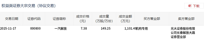 11月17日,一汽解放大宗交易成交149.25万股,成交额1101.49万元,占当日总成交额的2.57%,成交价 7.38元,较市场收盘价7.42元折价0.54%。 | 权益类证券大宗交易(协议交易) | | | | | | | 团 下载 | | --- | --- | --- | --- | --- | --- | --- | --- | | 交易日期 | 证券代码 | 证券简称 | 成交价格 (元) | 成交量 (万股/万份) | 成交金额 (万元) | 买方营业部 | 卖方营业部 | | 2025-11-17 | 0008000 | 一汽解放 | 7.38 | 149.25 | 1,101.4 机构专用 | | 光大证券股份有限 公司长春解放大路 证券营业部 | ...