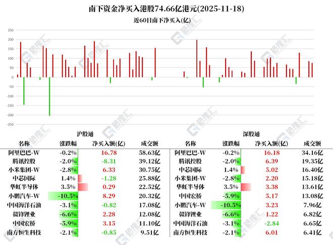 Core Viewpoint - Southbound funds have net bought Hong Kong stocks amounting to 74.66 billion HKD on November 18, with significant purchases in major companies like Alibaba and Xpeng [1] Group 1: Net Purchases - Net purchases included Alibaba-W at 32.97 billion HKD, Xpeng Motors-W at 11.52 billion HKD, and Xiaomi Group-W at 8.53 billion HKD [1] - Other notable net purchases were China Hongqiao at 8.32 billion HKD, Southern Hang Seng Technology at 5.15 billion HKD, SMIC at 3.74 billion HKD, Hua Hong Semiconductor at 3.66 billion HKD, and Ganfeng Lithium at 3.5 billion HKD [1] Group 2: Net Sales - The net sales included China National Offshore Oil Corporation at 3.65 billion HKD and Tencent Holdings at 1.91 billion HKD [1] Group 3: Trends - Southbound funds have recorded net purchases in Xiaomi for 15 consecutive days, totaling 106.6072 billion HKD [1] - Alibaba has seen net purchases for 4 consecutive days, amounting to 90 billion HKD [1]