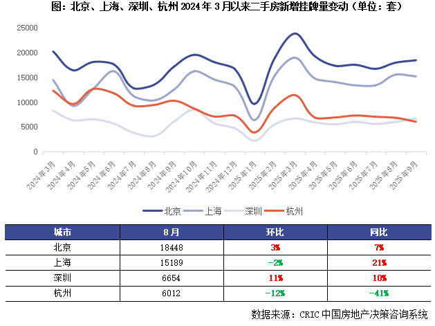 智通财经APP获悉,克而瑞地产研究10月23日发文称,预计整体二手房市场成交规模仍将延续波动走势。 2025年9月二手房市场成交仍处于缓步下行通道,据CRIC监测数据,2025年9月30个重点城市二手房成交环 比下降1%,同比增长9%,增长动能放缓。 京深新增二手挂牌套数同环比双增仅杭州波动下行 为了更好的分析二手房业主心态变化,该机构主力聚焦了北京、上海、深圳、杭州等核心一二线城市,从 CRIC监测的四城新增挂牌套数来看,9月四城挂牌量与8月基本持平,京深同环比齐增,上海同比涨幅超2 成。仅杭州一城同环比齐跌,业主挂牌积极性稳步回落。 (1)北京小于300万元低总价段刚需刚改房源和600-3000万元中高改房源业主挂牌积极性回升,新增挂牌量占 比环比持增,其中100-300万既是新增挂牌量主力,占比超3成,同时增幅在各面积段中也较为显著。 (2)上海、深圳中高改业主较为活跃,9月总价500-600万元和800-3000万元房源占比显著回升的特征;高端房 源占比持稳,波幅较小。 (3)杭州总价600万以内房源占比超8成,不过9月集中度稳步下降,环比跌幅达1.77pcts;而600-800万元和 1000-30 ...