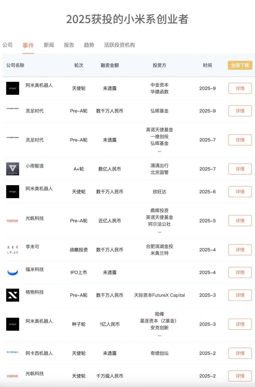Core Insights - 2025 is a pivotal year for embodied intelligence, with many entrepreneurs and capital competing in this space, particularly those with backgrounds from Xiaomi [1] - Xiaomi's unique combination of internet/AI and hardware expertise has led to a wave of successful startups founded by former Xiaomi executives, who are now attracting significant investment [1] Group 1: Xiaomi Alumni Startups - Xiao Yu Zhi Zao, founded by former Xiaomi MIUI head Qiao Zhongliang, focuses on "one brain, multiple forms" embodied intelligent robots, recently securing hundreds of millions of RMB in A+ round financing from Didi Chuxing [5][10] - Ling Zu Shi Dai, co-founded by former Xiaomi robotics lead Wang Bo, specializes in core components and complete robot development, achieving significant order volumes and securing tens of millions of RMB in Pre-A+ round financing [6][8] - Ami Ao Robot, established by former Xiaomi autonomous driving head Liu Fang, has raised over 100 million RMB in seed funding and focuses on flexible production solutions in the 3C sector [9][10] Group 2: Emerging Technologies and Innovations - Akashi Robot, founded by former SenseTime employee Li Yong, is developing a guide robot system for visually impaired individuals and has received angel round funding from Qiji Chuangtan [12][14] - Li Wei Ke, a startup focused on wearable smart glasses, secured tens of millions of RMB in strategic investment from Hefei Binhu Jin Investment, aiming to penetrate the XR market with new AI products [15][20] - Guangfan Technology, founded by former Xiaomi team member Dong Hongguang, raised nearly 100 million RMB in Pre-A round financing, focusing on AI wearable hardware and general AI agents [21][22] Group 3: Investment Trends - The trend of investment in startups led by former Xiaomi executives is gaining momentum, with multiple rounds of financing reported across various companies in the embodied intelligence and smart hardware sectors [1][3][15]