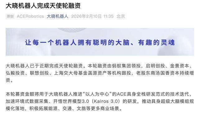 Group 1 - Daxiao Robotics has recently completed its angel round financing, led by Ant Group, with participation from Qiming Venture Partners, Jinjing Capital, Hongyi Investment, Lenovo Capital, and others [1] - The funds raised will be used to advance Daxiao Robotics' "human-centered" ACE embodied full-stack R&D paradigm, accelerate environmental data collection, and develop the Kairos 3.0 world model [1] - The company aims to promote the large-scale implementation of its embodied super brain module and actively expand into commercial scenarios such as energy, transportation, and cultural tourism [1] Group 2 - Daxiao Robotics was established in July 2025 as a new business under SenseTime, with co-founder Wang Xiaogang serving as chairman [3] - The company focuses on autonomous decision-making capabilities in robotics and has introduced the world's first ACE technology paradigm and the Kairos 3.0 world model, enabling autonomous navigation through pure vision [3] - Daxiao Robotics has formed strategic partnerships with multiple enterprises to facilitate the implementation of its technology in industrial scenarios [3]