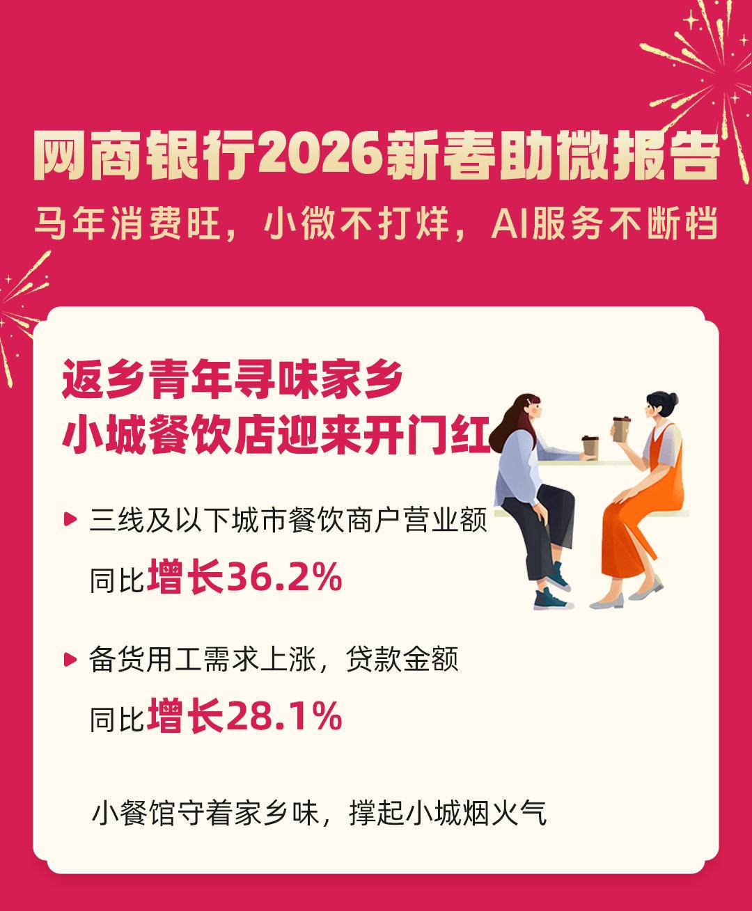 县城消费火爆,小城餐饮商家营业额同比增长超3成;春节宠物陪伴经济趋热,网商户营收增长超六成……网商银行刚刚发布的2026年新春助微报告显 示,马年春节呈现"居民消费热、小微经济活、金融服务不断档"的新气象:返乡经济、冰雪旅游、宠物经济等新消费多点开花,三线及以下城市小微经济 活力凸显。 春节消费"万马奔腾",宠物陪伴等新业态点亮新春烟火气 今年春节期间,居民消费需求集中释放,线下消费强势回暖,县域消费成为拉动新春经济的重要引擎。 返乡潮激活小城消费活力,餐饮行业率先迎来开门红。网商银行数据显示,受返乡客流带动,三线及以下城市餐饮消费持续火爆,相关商户营业额同比增 长36.2%;同时,客流回归带动备货、用工等需求同步攀升,商户经营性贷款金额同比增长28.1%。一碗家乡热汤,既撑起了浓浓年味,更彰显小城经济 的强劲韧性。 刚落幕的米兰冬奥会,点燃了全国冰雪旅游热。全国滑雪场商户营业额同比增长55.9%,贷款金额也同比增长50.6%,小城滑雪场更成为新春热门打卡 地,河北崇礼、新疆阿勒泰、黑龙江亚布力、吉林松花湖、北京密云跻身TOP5热门滑雪地。 伴随年轻人陆续回乡,宠物陪伴生意也开始走俏。网商银行数据显示,春节期 ...