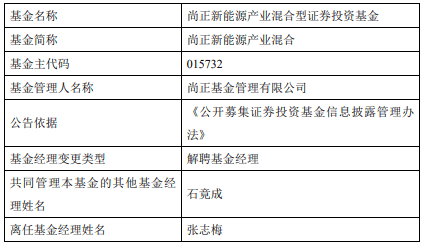 Group 1 - The core point of the article is the announcement of the resignation of Zhang Zhimei as the fund manager of the Shangzheng New Energy Industry Mixed Fund, with Shi Jingcheng taking over the management role [1][2]. - Shi Jingcheng has been with the company as an industry researcher since August 2021 and will officially assume the role of fund manager starting April 3, 2025 [1][2]. - The Shangzheng New Energy Industry Mixed Fund A/C was established on August 10, 2022, and as of November 14, 2025, it has recorded a year-to-date return of 21.40% and 20.75%, while the cumulative return since inception is -28.47% and -29.87%, with net asset values of 0.7153 yuan and 0.7013 yuan respectively [1][2]. Group 2 - The fund is managed by Shangzheng Fund Management Co., Ltd., and the change in fund manager is in accordance with the "Publicly Raised Securities Investment Fund Information Disclosure Management Measures" [2]. - The fund's main code is 015732, and the announcement is part of the regulatory requirements for fund management [2].