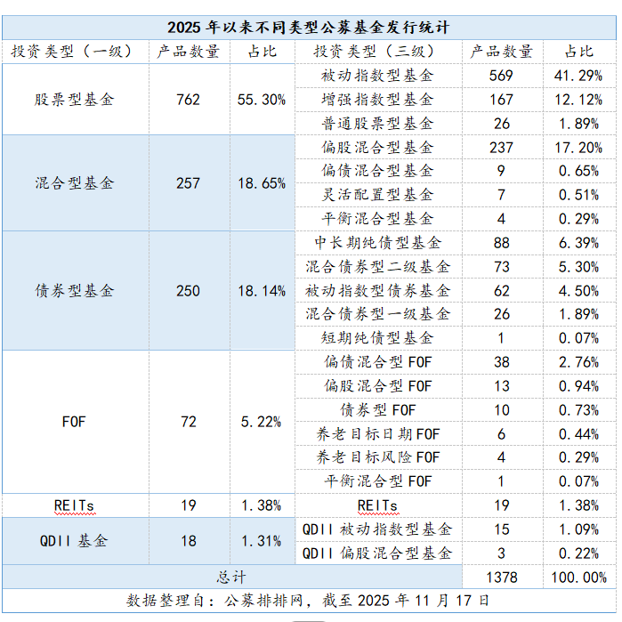 指数化投资的崛起格外引人注目。在今年发行的1378只新基中,指数型基金的数量达到813只,占 总量的59%。这一数据直观地展现出指数化投资在市场中的热度与重要性。 2025年以来,公募基金发行市场迎来显著变化。 据公募排排网数据,截至2025年11月17日,按认购起始日统计,今年以来全市场共计发行公募基金 1378只,这一数字远超去年全年的1143只,并且创下近3年的新高,同时也终止了基金发行连续3年下滑 的颓势。 此外,今年以来发行新基平均认购天数为16.31天,与去年22.63的平均认购天数相比,募集周期明 显大幅缩短,进一步验证了基金发行市场的回暖。 | | | 2025年以来不同奏型公募基金发行统计 | | | | | --- | --- | --- | --- | --- | --- | | 投资类型(一级) | 产品数量 | 卡比 | 投资类型(三级) | 产品数量 | 占比 | | | | | 被动指数型基金 | રેસ | 41. 29% | | 股票型基金 | 762 | 55. 30% | 增强指数型基金 | 167 | 12. 12% | | | | | 普通股票型基金 | 26 | 1 ...