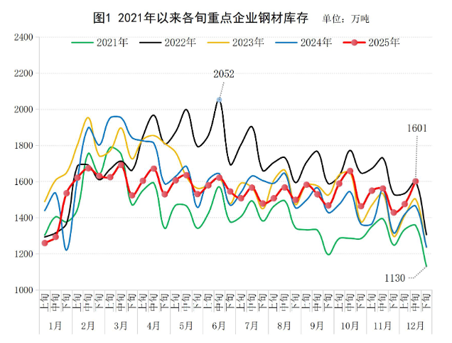新华财经北京12月24日电中钢协发布2025年12月中旬重点企业钢材库存旬报。2025年12月中旬,重点统 计钢铁企业钢材库存量1601万吨,环比上一旬增加126万吨,增长8.6%;比年初增加364万吨,增长 29.5%;比上月同旬增加40万吨,增长2.6%;比去年同旬增加137万吨,增长9.4%,比前年同旬增加99 万吨,增长6.6%。 (文章来源:新华财经) ...
