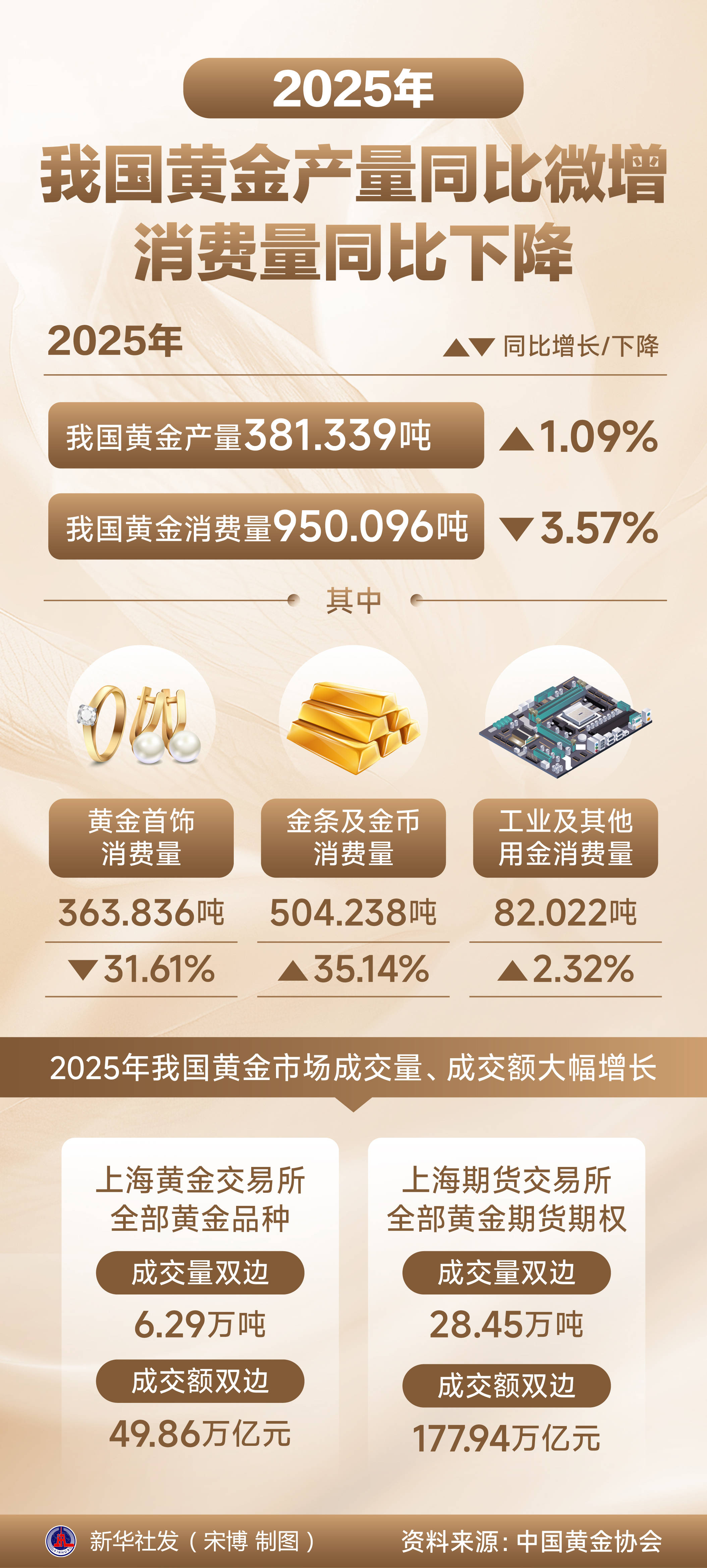 (图表)2025年我国黄金产量同比微增 消费量同比下降