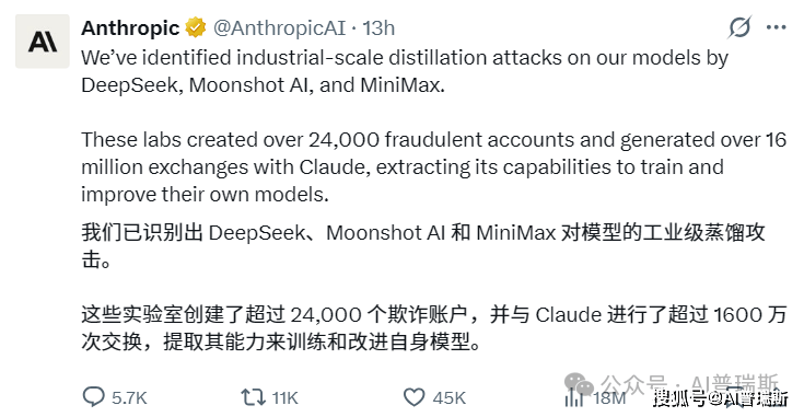 AIPress.com.cn报道 2月24日消息,Anthropic在周一发布的博客文章中称,DeepSeek、Moonshot AI和MiniMax通过约2.4万个虚 假账户,与Claude进行了超过1600万次交互,从而提取模型能力,用于训练和优化自家模型。突发! Anthropic声称被三家中国AI公司蒸馏 随后,马斯克在社交平台X上发文称,Anthropic"曾大规模窃取训练数据",并声称其曾因此支付数十亿美 元和解金。他还附上"X社区注释"的截图作为佐证。 在回应网友的质疑时,马斯克直言Anthropic这样的做法是自鸣得意、伪善、虚伪的。 目前,Anthropic尚未就马斯克的相关指控作出进一步回应。 ...