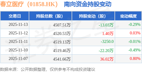 春立医疗(01858.HK):11月13日南向资金减持13.02万股