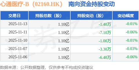 心通医疗-B(02160.HK):11月13日南向资金减持1.4万股