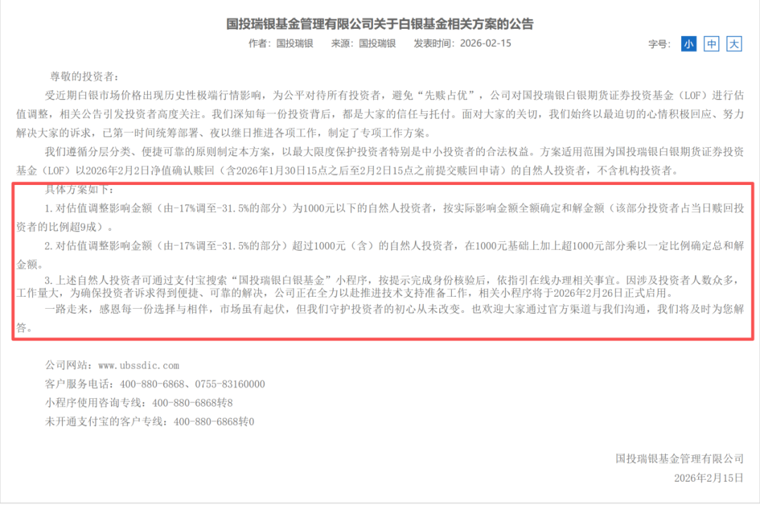 国投瑞银白银LOF一事迎来关键时点。 2月15日,国投瑞银基金管理有限公司(下称国投瑞银)发布公告称,对估值调整影响金额为1000元以下的自然 人投资者,按实际影响金额全额确定和解金额;对估值调整影响金额超过1000元(含)的自然人投资者,在 1000元基础上加上超1000元部分乘以一定比例确定总和解金额。 国投瑞银表示,此次方案遵循分层分类、便捷可靠的原则,以最大限度保护投资者特别是中小投资者的合法权 益。 分层分类补偿方案出炉 国投瑞银发布的最新公告显示,受近期白银市场价格出现历史性极端行情影响,公司对国投瑞银白银期货证券 投资基金(LOF)进行估值调整,相关公告引发投资者高度关注。 "深知每一份投资背后,都是大家的信任与托付。"国投瑞银表示,面对大家的关切,我们始终以最迫切的心情 积极回应、努力解决大家的诉求,已第一时间统筹部署、夜以继日推进各项工作,制定了专项工作方案。 遵循分层分类、便捷可靠的原则,国投瑞银制定本方案,以最大限度保护投资者特别是中小投资者的合法权 益。方案适用范围为国投瑞银白银期货证券投资基金(LOF)以2026年2月2日净值确认赎回(含2026年1月30 日15点之后至2月2日15 ...