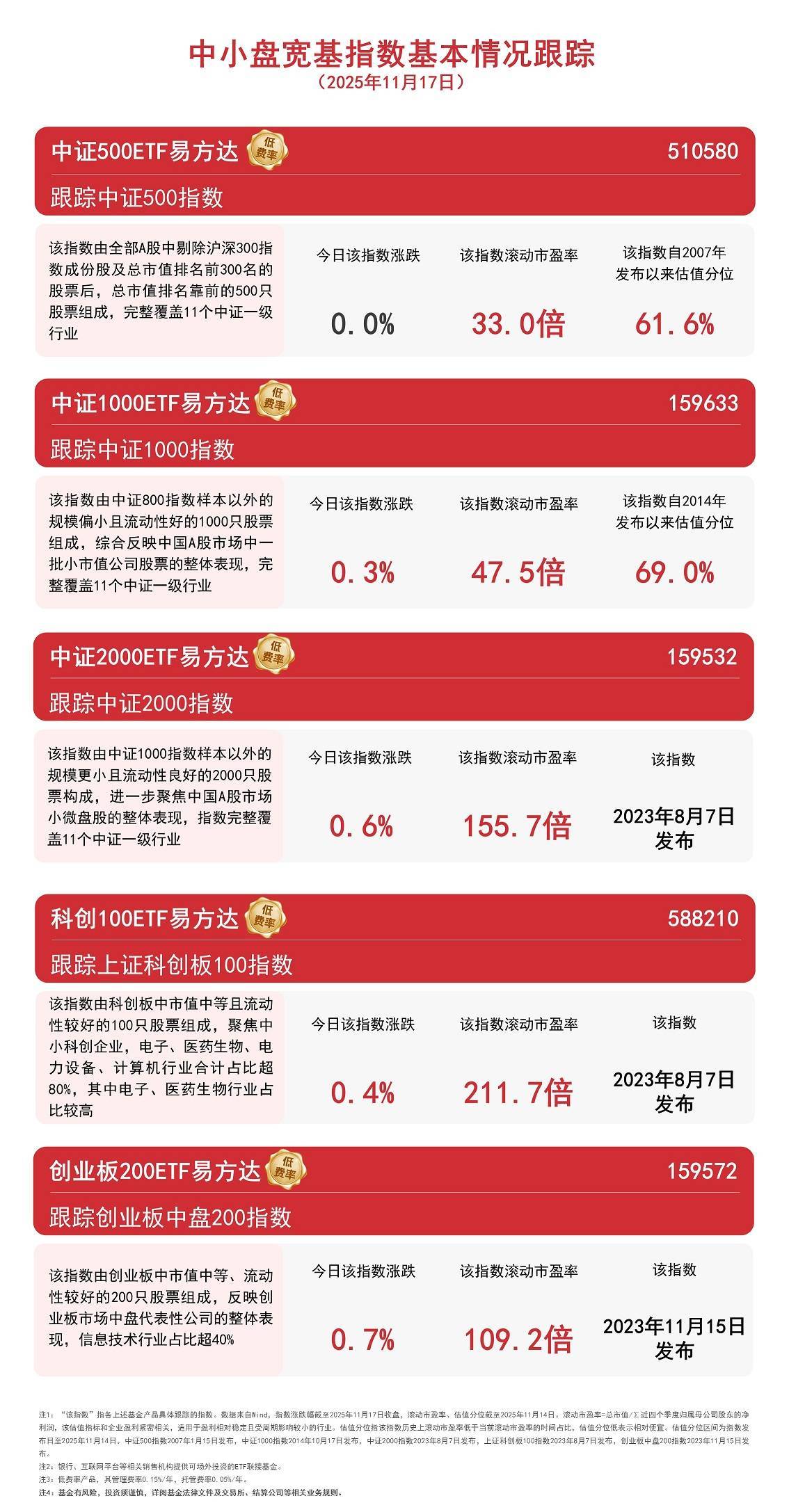 截至收盘,创业板中盘200指数上涨0.7%,中证2000指数上涨0.6%,科创100指数上涨0.4%,中证1000指数上涨0.3%,中证500指数接近平收。 据工信部近日披露,截至目前,我国已累计培育科技和创新型中小企业超60万家,专精特新中小企业超14万家,国家级专精特新"小巨人"企业超1.76万家, 其中"小巨人"企业以占全国规模以上工业中小企业3.5%的数量,贡献了9.6%的营业收入和13.7%的利润,反映专精特新发展步伐坚实。 | 中证500ETF易方达 | | | 510580 | | --- | --- | --- | --- | | 跟踪中证500指数 | | | | | 该指数由全部A股中剔除沪深300指 | 今日该指数涨跌 | 该指数滚动市盈率 | 该指数自2007年 | | 数成份股及总市值排名前300名的 | | | 发布以来估值分位 | | 股票后,总市值排名靠前的500只 | | | | | 股票组成,完整覆盖11个中证一级 行业 | 0. 0% | 33.0倍 | 61. 6% | | 中证1000ETF易方达 | | | 159633 | | 跟踪中证1000指数 | | | | ...