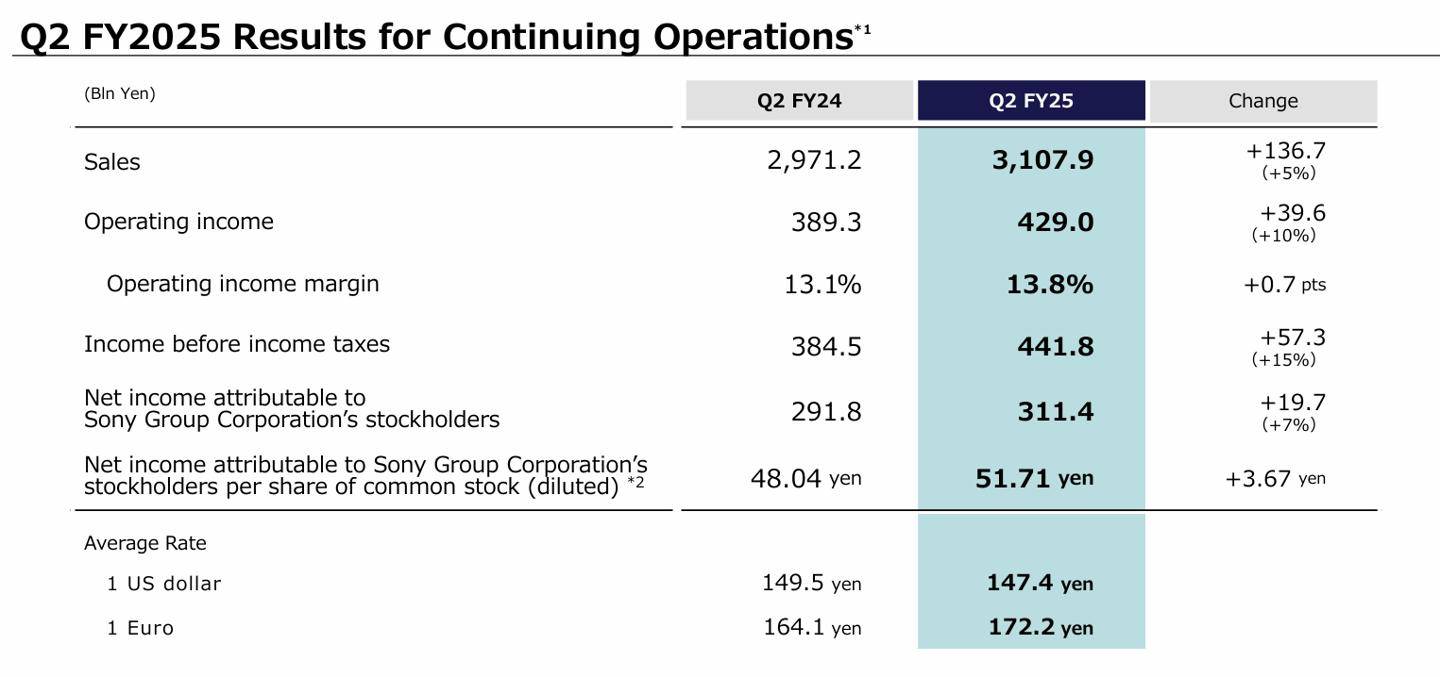 Core Insights - Sony Group reported its consolidated financial results for the second quarter ending September 30, 2025, showing a positive growth trajectory in sales and profits [1] Financial Performance - Sales for Q2 FY25 reached 3,107.9 billion yen, a 5% increase from 2,971.2 billion yen in Q2 FY24 [5] - Operating income rose to 429.0 billion yen, reflecting a 10% increase from 389.3 billion yen in the previous year [5] - Net income attributable to Sony Group Corporation's stockholders was 311.4 billion yen, up 7% from 291.8 billion yen in Q2 FY24 [5] Business Segment Performance - Game & Network Services saw sales increase to 1,113.2 billion yen, up 41 million yen, but operating income decreased to 120.4 billion yen, down 18 million yen [4] - Music segment sales grew significantly to 542.4 billion yen, an increase of 94 million yen, with operating income rising to 115.4 billion yen, up 25 million yen [4] - Imaging & Sensing Solutions reported sales of 614.6 billion yen, an increase of 79 million yen, with operating income rising to 138.3 billion yen, up 45 million yen [4] - Pictures segment sales decreased to 346.0 billion yen, down 9 million yen, with operating income also declining to 13.9 billion yen, down 4 million yen [4] - Entertainment, Technology & Services segment sales fell to 575.7 billion yen, down 44 million yen, with operating income decreasing to 61.0 billion yen, down 9 million yen [4] Revised Financial Outlook - Sony raised its full-year revenue forecast for FY2025 to 12 trillion yen (approximately 5,547 billion yuan), with operating profit expectations increased to 1.43 trillion yen (approximately 661.02 billion yuan) and net profit expectations raised to 1.05 trillion yen (approximately 485.36 billion yuan) [2]