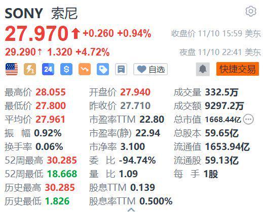 格隆汇11月11日|索尼(SONY.US)夜盘涨4.72%,报29.29美元。消息面上,索尼集团第二季度经营利润 4,289.7亿日元,预估3,921.6亿日元;销售净额3.11万亿日元,预估3.01万亿日元。索尼目前预计全财年 经营利润为1.43万亿日元,此前预期为1.33万亿日元。索尼认为,美国关税影响比之前预期的小,目前 预计为500亿日元。此外,根据东京证券交易所周二的一份文件,索尼集团董事会批准了一项1000亿日 元的股票回购计划,允许该公司回购至多3500万股,占其已发行股票的0.6%。 | SONY 索尼 | | | | --- | --- | --- | | 27.970 + +0.260 +0.94% | | 收盘价 11/10 15:59 美东 | | 29.290 + 1.320 +4.72% | | 夜盘 11/10 22:41 美东 | | 一 5 24 S ~ 8 同 ♥ B | | ● ஐ捷交易 | | 最高价 28.055 | 开盘价 27.940 | 成交量 332.5万 | | 最低价 27.800 | 昨收价 27.710 | 成交额 9297.2万 | | 平均价 27 ...