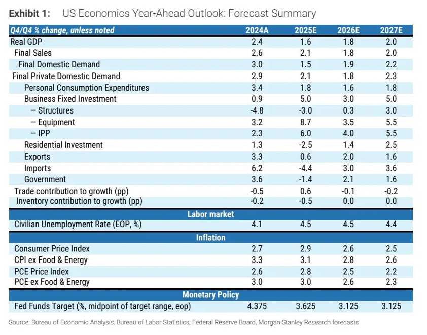 华尔街金融巨头摩根士丹利最新发布的一份研报显示,在特朗普政府2025年通过的OBBBA减税法案(即所谓的"大而美"法案)将从2026年开始强劲推动经济增 长效应,叠加特朗普关税政策带来的物价上扬最终被证实为暂时性的通胀扰动直至短期通胀逐渐消散,以及微软、谷歌等科技巨头们围绕AI算力基础设施 为核心的AI数据中心建设进程如火如荼,将共同带动美国经济在2026年呈现出"金发姑娘式的软着陆"的这一温和增长宏观环境。 大摩宏观分析师团队表示,预计2025年美国实际GDP同比增长1.6%(当年四季度的实际GDP相对上一年四季度的增速),预计2026年实际GDP同比增1.8%,以 及2027年有望同比增长2%,按照大摩的最新展望,这些实际GDP增速预期意味着美国经济终将实现美联储官员们心心念念的美国经济金发姑娘式软着陆蓝 图。 | Exhibit 1: US Economics Year-Ahead Outlook: Forecast Summary | | --- | | Q4/Q4 % change, unless noted | 2024A | 2025E | 2026E | 2027E | | --- | --- ...