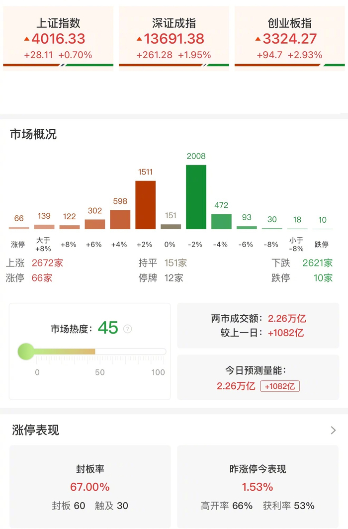 今日A股市场全天震荡拉升,三大指数高开高走,创业板指涨近3%创年内新高, 沪指再度回升至4000点上方,北证50指数涨超8%。 沪深两市成交 额2.26万亿,较上一个交易日放量1082亿。 市场概况 2008 1511 598 472 302 151 122 139 93 66 30 18 10 大于 小于 涨停 -6% +4% -2% -8% +8% +6% +2% 0% -4% 跌停 +8% -8% 下跌 2621家 上涨 2672家 持平 151家 跌停 停牌 12家 10家 涨停 66家 | 市场热度:45 0 | 两市成交额:2.26万亿 较上一日: +1082亿 | | --- | --- | | - THE FORD THE FOR COLLECTION COLLECTION - | | | 0 50 100 | 今日预测量能: | | | 2.26万亿 +1082亿 | 下载财联社APP获取更多资讯 准确 快速 权威 专业 7x24h电报 头条新闻 VIP资讯 实时盯盘 盘面上,市场热点快速轮动, 储能板块表现活跃 ,阳光电源大涨创新高,通润装备涨停。光伏板块爆发,隆基绿能、通威股份等多股涨停 ...