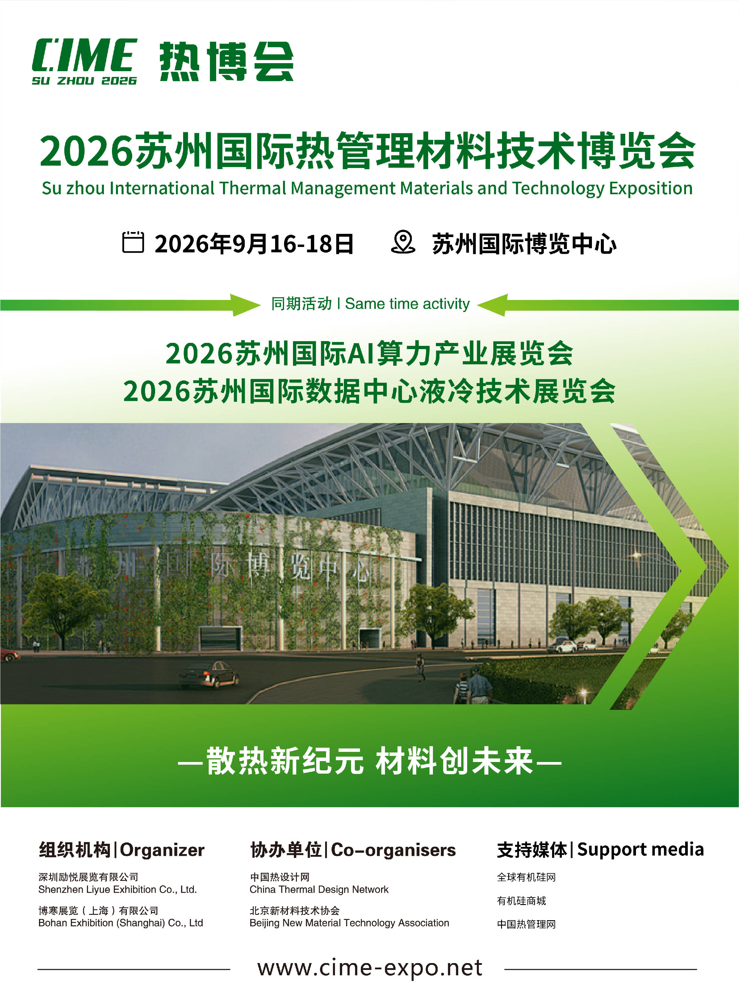 苏州举办的热管理材料相关展览会。展会主要聚焦于热管理材料、设备及技术解决方案,服务于新能源、汽车、电子等多个行业。 CIME 2026苏州国际热管理材料技术博览会 实用信息 时间:2026年9月16日 - 18日 地点:苏州国际博览中心 规模:展览面积15,000平方米,预计300+参展商,30,000人次专业观众 重点领域:为新能源电池、汽车应用、5G通信等行业提供轻量化热管理材料解决方案 覆盖范围:导热/散热材料全产业链,重点邀约新能源、汽车制造、半导体等领域观众 内容:展会涵盖导热、散热、隔热、储热等领域,包括热管理材料、液冷产业、仪器设备等,预计吸引近20,000名专业观众 苏州国际博览中心是上述多个展会的主要举办地,地址为江苏省苏州市苏州工业园区月廊街新光天地西侧约150米。 如需了解更详细的参展或参观信息,建议直接访问展会官方网站或联系主办方。 2026苏州国际数 散热新纪 组织机构|Organizer 协办单位| 深圳励悦展览有限公司 Shenzhen Liyue Exhibition Co., Ltd. 博寒展览(上海)有限公司 Bohan Exhibition (Shanghai) Co., ...
