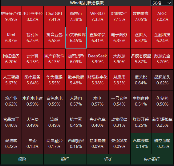 | | | | Wind热门概念指数 | | | | V 60督 | | --- | --- | --- | --- | --- | --- | --- | --- | | 拼多多合作 小红书平台 | | ChatGPT | 稳定币 | WEB3.0 | 炒股软件 | 数据要素 | AIGC | | 9.49% | 8.02% | 7.41% | 7.38% | 7.33% | 7.15% | 7.05% | 7.02% | | Kimi | 智能体 | 抖音豆包 | 世界郎父母 | 直播带货 | 电子商务 | 虚拟人 | 金融科技 | | 6.87% | 6.75% | 6.58% | 6.45% | 6.41% | 6.35% | 6.32% | 6.24% | | 网红经济 | 云计算 | 国产软硬件 | 加密货币 | DeepSeek | 大数据 | 多模态模型 | 数据安全 | | 6.20% | 6.13% | 6.13% | 6.09% | 5.99% | 5.90% | 5.87% | 5.70% | | 人工智能 | 医疗服务 | 华为鲲鹏 | 数字政府 | 财税数字化 | AIMH | 反 ...