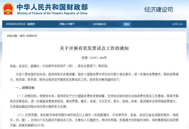 财政部、商务部、国家税务总局2025年12月31日对外发布通知称,为进一步激发消费需求,释放消费潜 力,三部门将支持50个左右城市开展有奖发票试点工作,政策实施期为6个月。 财政部、商务部、国家税务总局有关负责人介绍,此次出台的有奖发票试点政策着重从需求端发力,鼓 励居民消费并取得发票后参与抽奖。试点政策覆盖日常消费主要场景,如购物、外出就餐、旅游住宿、 文体活动、生活服务等,与居民"衣食住行"密切相关。 通知明确,试点城市申报范围为地市级及以上城市(包括直辖市,计划单列市,各省、自治区省会或首 府城市,地级市、州、盟)。中央财政将对试点城市分档安排奖补资金。 三部门有关负责人表示,试点城市将按照通知要求,结合地方实际,制定有奖发票试点工作实施方案, 明确有奖发票范围、参与方式、中奖规则、奖项设置、兑奖方法、违法行为举报等要求,并向社会公 布。消费者可关注试点城市公告,根据公布的有奖发票活动具体要求,积极参与。 来源丨新华社 官网截图 通知称,试点城市对个人消费者以本人名义向零售、餐饮、住宿、文化艺术、娱乐、旅游、体育、居民 服务业等行业的经营主体购买商品和服务,且取得的票面金额在一定额度以上的发票组织抽奖。 ...