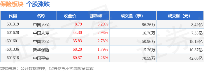 | 代码 | 名称 | 收盘价 | 涨跌幅 | 成交量(手) | 成交额(元) | | --- | --- | --- | --- | --- | --- | | 61319 | 中国人保 | 8.79 | 3.29% | 96.26万 | 8.42 乙 | | 601628 | 中国人寿 | 44.30 | 2.98% | 16.70万 | 7.35 Z | | 601601 | 中国太保 | 35.83 | 2.78% | 50.96万 | 18.18亿 | | 601336 | 新华保险 | 68.20 | 1.79% | 15.26万 | 10.37亿 | | 601318 | 中国平安 | 60.37 | 1.26% | 70.59万 | 42.68亿 | 证券之星消息,11月19日保险板块较上一交易日上涨2.43%,中国人保领涨。当日上证指数报收于 3946.74,上涨0.18%。深证成指报收于13080.09,下跌0.0%。保险板块个股涨跌见下表: 从资金流向上来看,当日保险板块主力资金净流出7.57亿元,游资资金净流入3.17亿元,散户资金净流 入4.39亿元。保险板块个股资金流向见下表: 以 ...