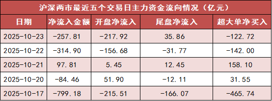 10月23日,A股市场整体上涨。 截至收盘,上证指数收报3922.41点,上涨0.22%;深证成指收报13025.45点,上涨0.22%;创业板指收报3062.16 点,上涨0.09%。两市合计成交16439.1亿元,较上一交易日减少239.47亿元。 1. 两市主力资金净流出超250亿元 今日沪深两市主力资金开盘净流出217.92亿元,尾盘净流入35.86亿元,全天净流出257.81亿元。 | | | 沪深两市最近五个交易日主力资金流向情况(亿元) | | | | --- | --- | --- | --- | --- | | 日期 | | 净流入金额 开盘净流入 | 尾盘净流入 | 超大单净买入 | | 2025-10-23 | -257.81 | -217.92 | 35. 86 | -122. 72 | | 2025-10-22 | -314.90 | -156. 68 | -31. 77 | -142. 00 | | 2025-10-21 | 97. 81 | 5. 45 | 12. 45 | 158. 10 | | 2025-10-20 | -84. 46 | 51. 90 | -12. 11 | ...