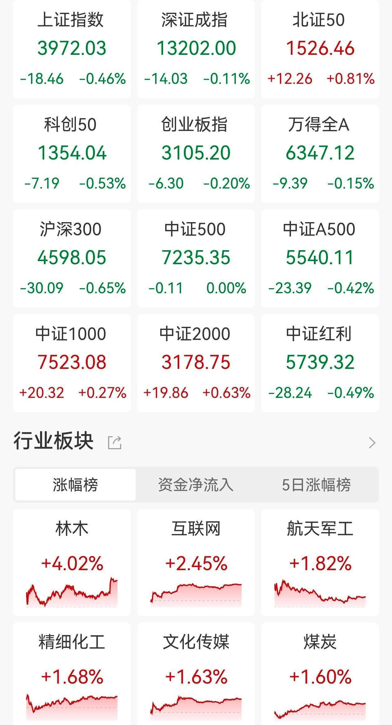 盘面上,能源金属、兵装重组概念、数字水印板块涨幅居前,贵金属、生物制品、医药商业板块跌幅居前。 11月17日消息,市场震荡调整,三大指数尾盘拉升跌幅收窄。板块方面,临近尾盘CPO概念震荡反弹,腾景科技20cm涨 停,德科立、长芯博创、光库科技、中际旭创涨幅靠前;华为算力概念全天强势,中孚信息、博睿数据20cm涨停;AI应用端 活跃,三六零、宣亚国际、航天发展等多股涨停;下跌方面,贵金属板块全天调整,招金黄金跌幅居前;创新药板块大面积飘 绿,科兴制药跌幅居前。总体来看,个股跌多涨少,下跌个股超2700只。 截至收盘,沪指报3972.03点,跌0.46%;深成指报13202.00点,跌0.11%;创指报3105.20点,跌0.20%。 ...