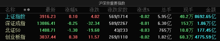 凤凰网财经讯 10月16日,市场冲高回落,三大指数盘中一度集体翻绿。截至收盘,沪指涨0.1%,深成 指跌0.25%,创业板指涨0.38%。沪深两市成交额1.93万亿,较上一个交易日缩量1417亿。 | | | | | 沪深京重要指数 | | | | --- | --- | --- | --- | --- | --- | --- | | 名称 *● | 最新 | 涨幅% | | 张跌 涨跌家数 张速% | R. R. F. | 现手 金额 | | 上证指数 | 3916.23 | 0.10 | 4.02 | 569/1714 | -0.02 5.95 7. | 40.2万 8692.65亿 | | 深证成指 | 13086.41 | -0.25 | -32.34 | 589/2267 | -0.01 6.30 7 | 153万 1.06万亿 | | 北证50 | 1488.71 | -1.30 | -19.60 | 43/233 | -0.03 765万 | 10.0万 177.45亿 | | 创业板指 | 3037.44 | 0.38 | 11.57 | 269/1110 | -0.02 1.82 7. | ...