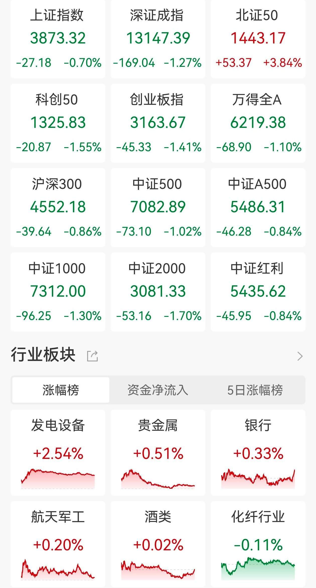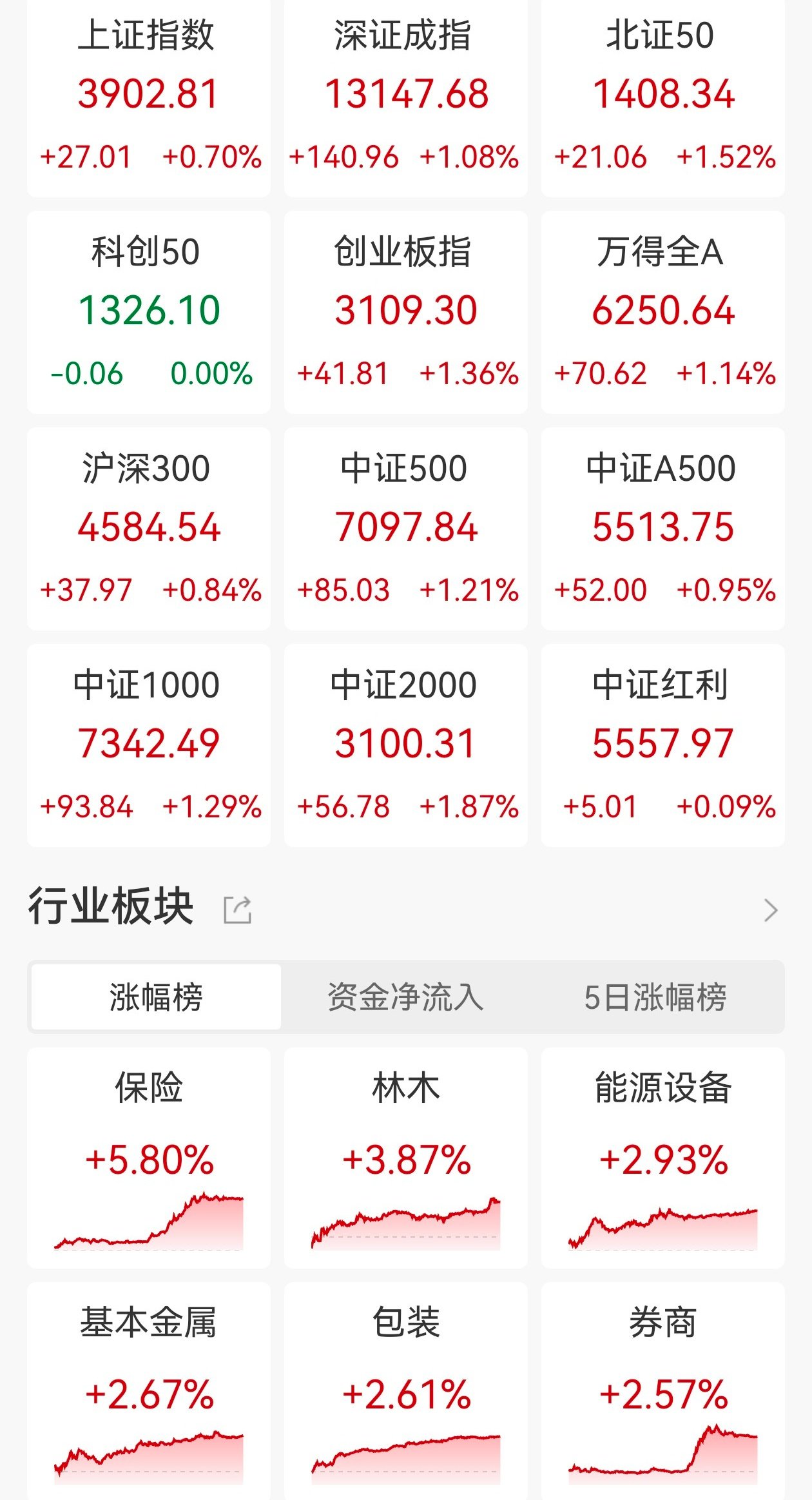 资金净流入 涨幅榜 5日涨幅ł 保险 林木 能源设i +5.80% +2.939 +3.87% 包装 基本金属 券商 +2.67% +2.61% +2.579 | 上证指数 | 深证成指 | 北证5C | | --- | --- | --- | | 3902.81 | 13147.68 | 1408.3 | | +27.01 +0.70% +140.96 +1.08% +21.06 +1 | | | | 科创20 | 创业板指 | 万得全/ | | 1326.10 | 3109.30 | 6250.6 | | -0.06 0.00% +41.81 +1.36% +70.62 +1 | | | | 沪深300 | 中证500 | 中证A5( | | 4584.54 | 7097.84 | 5513.7 | | +37.97 +0.84% +85.03 +1.21% +52.00 +0 | | | | 中证1000 | 中证2000 | 中证红 | | 7342.49 | 3100.31 | 5557.9 | | +93.84 +1.29% +56.78 +1.87% +5.01 +0 | | | A股三大指数今 ...