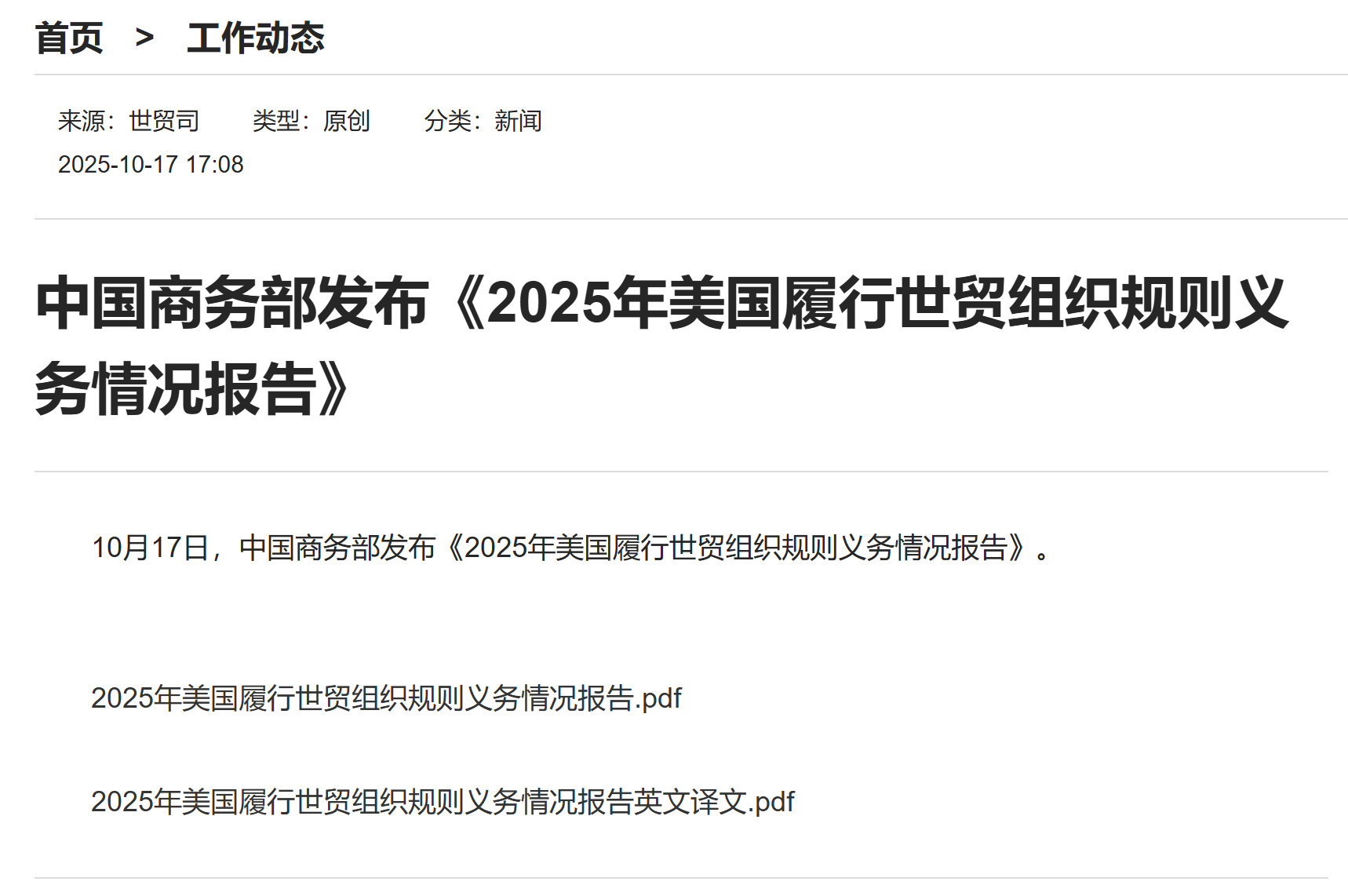 21世纪经济报道记者周潇枭 见习记者张旭 北京报道 10月17日,中国商务部发布《2025年美国履行世贸组织规则义务情况报告》。 报告第一部分从四个方面对美国履行世贸组织规则义务情况进行总体评价。报告指出,美国作为多边贸易体制的重要创立者和主要受益者,理应在守规践诺 方面发挥表率作用,维护多边贸易体制的权威性和有效性。然而,美国出于转嫁国内矛盾、维护自身霸权等原因,以"美国第一"为出发点,无视世贸组织规 则与成员的期待,大搞单边主义、保护主义和经济霸凌,对多边贸易体制造成了严重冲击。 商务部世贸司负责人表示,2023年以来,中方基于美国履行世贸组织规则义务的客观情况,连续发布美国履行世贸组织规则义务情况年度报告,表达对美国 破坏多边贸易体制、实施贸易霸凌、操纵产业政策双重标准、扰乱全球产业链供应链等政策措施的关切。 2024年报告发布以来,美国继续罔顾成员期待,与世贸组织规则义务背道而驰,不断升级单边主义措施,频繁实施歧视性政策,推出所谓"对等关税",发动 全球贸易战,严重侵犯各国正当权益,严重违反世贸组织规则,严重损害以规则为基础的多边贸易体制。基于上述情况,商务部发布2025年报告,继续表达 对美国相关政 ...