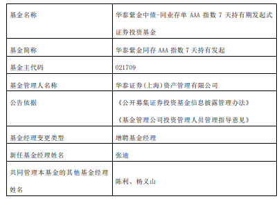 中国经济网北京12月12日讯 今日,华泰证券(上海)资产管理有限公司公告,华泰紫金同存AAA指数7天 持有发起增聘张迪。 张迪2017年4月加入华泰证券(上海)资产管理有限公司,从事固定收益投资与研究工作,现担任华泰 紫金天天发货币市场基金、华泰紫金货币增利货币市场基金的基金经理。 华泰紫金同存AAA指数7天持有发起成立于2024年7月31日,截至2025年12月11日,其今年来收益率为 0.83%,成立来收益率为1.47%,累计净值为1.0147元。 | 基金名称 | 华泰蒙金中债-同业存单 AAA 指数 7 天持有期发起式 | | --- | --- | | | 证券投资基金 | | 基金简称 | 华泰蒙金同存 AAA 指数 7 天持有发起 | | 基金主代码 | 021709 | | 基金管理人名称 | 华泰证券(上海)资产管理有限公司 | | 公告依据 | 《公开募集证券投资基金信息披露管理办法》 | | | 《基金管理公司投资管理人员管理指导意见》 | | 基金经理变更类型 | 增聘基金经理 | | 新任基金经理姓名 | 张迪 | | 共同管理本基金的其他基金经理 | 陈利、杨义山 | | 姓名 | ...