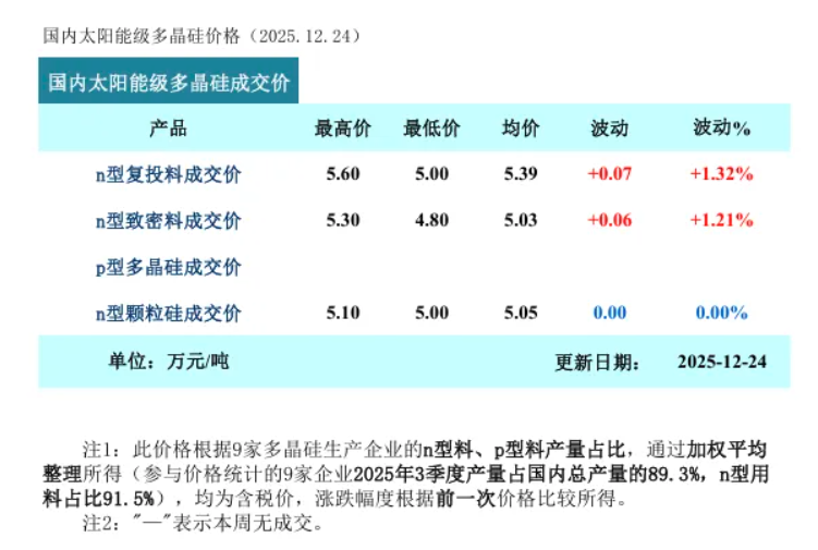 来源:上海证券报·中国证券网 上证报中国证券网讯(邱思雨 记者 操子怡)12月24日,中国有色金属工业协会硅业分会(简称"硅业分 会")发布多晶硅周评。 本周(12月18日至12月24日)多晶硅n型复投料成交价格区间为5.0-5.6万元/吨,成交均价为5.39万元/吨, 周环比上涨1.32%。n型颗粒硅成交价格区间为5.0-5.1万元/吨,成交均价为5.05万元/吨,环比持平。 | 国内太阳能级多晶硅成交价 | | | | | | | --- | --- | --- | --- | --- | --- | | 产品 | 最高价 | 最低价 | 均价 | 波动 | 波动% | | n型复投料成交价 | 5.60 | 5.00 | 5.39 | +0.07 | +1.32% | | n型致密料成交价 | 5.30 | 4.80 | 5.03 | +0.06 | +1.21% | | p型多晶硅成交价 | | | | | | | n型颗粒硅成交价 | 5.10 | 5.00 | 5.05 | 0.00 | 0.00% | | 单位:万元/吨 | | | | 更新日期: | 2025-12-24 | 据硅业分会统计, ...