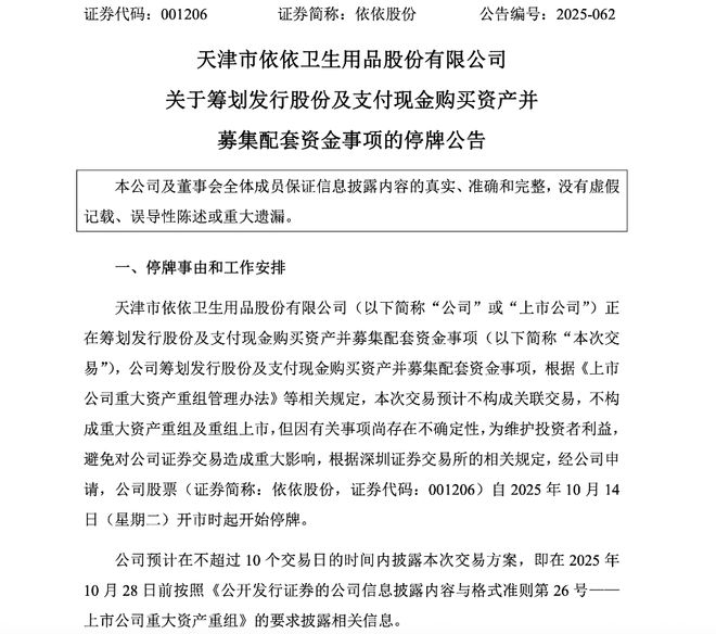 21世纪经济报道记者 刘婧汐 陈晗章 10月13日晚,依依股份(001206.SZ)发布停牌公告,公司称正筹划发行股份及支付现金购买资产并募 集配套资金事项,筹划事项的交易标的为杭州高爷家有好多猫宠物食品有限责任公司(下简称高爷 家),预计在不超过10个交易日的时间内,即在10月28日前披露本次交易方案。 公告内容显示,因有关事项尚存在不确定性,为维护投资者利益,避免对公司证券交易造成重大影响, 经公司申请,公司股票自2025年10月14日开市时起开始停牌。 大胆跨界 依依股份是一次性宠物卫生用品领域的龙头企业,主要经营宠物垫、宠物尿裤等产品,长期为多家国际 宠物品牌提供代工服务。2025年上半年,依依股份宠物一次性卫生护理用品营收占比为93.91%,同时 其有93.47%的收入来自境外。 而高爷家则主要经营中高端猫主粮,曾提出"透明粮"、"益生菌猫粮"等概念,其旗下还有猫砂品牌"许 翠花"。 这是依依股份的一次大胆跨界,意味着这个"宠物纸尿裤"的头部玩家即将通过资本运作入局宠物食品赛 道。要知道,高爷家所处在的宠物主粮品类正是宠物食品领域增长最快的赛道之一。 派读宠物发布的数据显示,2024年在宠物犬猫消费 ...