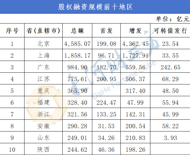 【大河财立方 记者 王时丹】当2025年的日历翻至最后一页,全国A股融资地图清晰呈现:全年股权融 资规模超万亿元,长三角、珠三角及环渤海地区持续领跑,北京、上海年内股权融资规模突破千亿元。 | | | | | | 单位:亿元 | | --- | --- | --- | --- | --- | --- | | 序号 | 省(直辖市) | 总额 | 首发 | 增发 = | 可转债发行 | | 1 | 北京 | 4.585.07 | 199. 08 | 4,362. 45 | 11 23. 54 | | 2 | 上海 | 1.858.17 | 96. 71 | 1.727.91 | 33. 55 | | 3 | 广东 | 984. 90 | 182. 70 | 559. 56 | 242. 65 | | 4 | 江苏 | 775.61 | 200. 95 | 506. 37 | 68. 29 | | 5 | 重庆 | 365. 90 | NE | 317. 40 | 48. 50 | | 6 | · 福建 | 328. 40 | 224. 47 | 47.99 | 55. 94 | | 7 | 浙江 | 321. ...