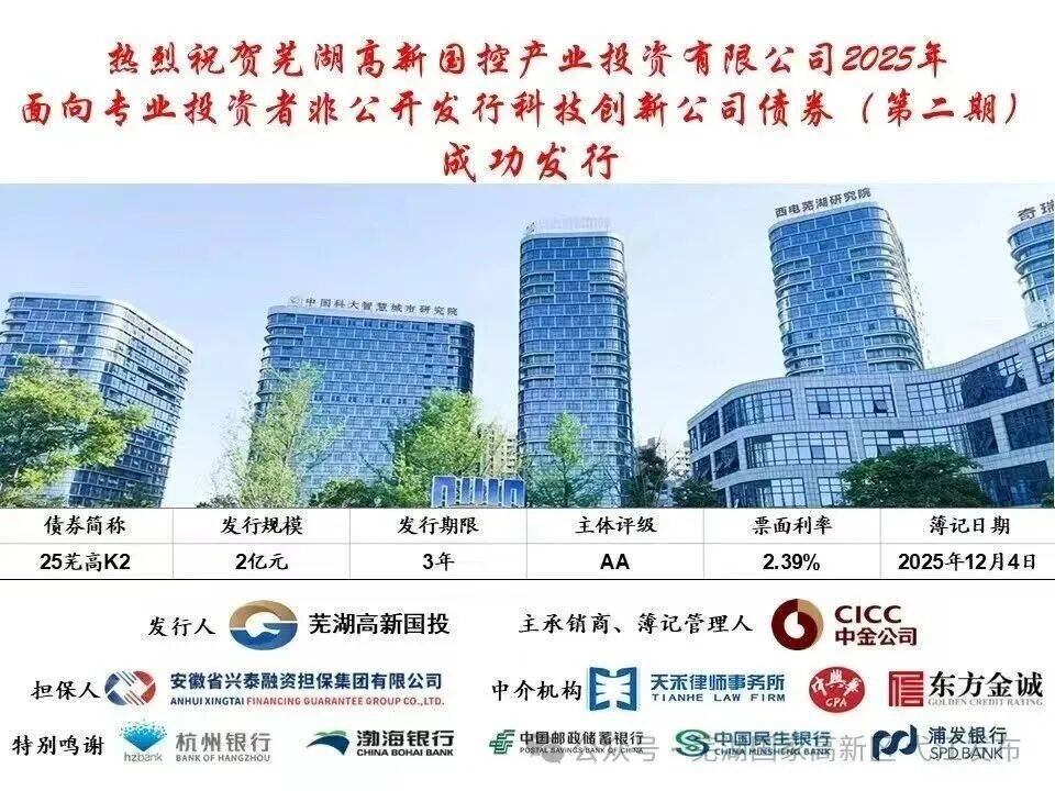 日前, 芜湖高新国控产业投资有限公司成功在深圳证券交易所发行全市首单科技创新公司债券。本期债券发行规模2亿元,期限3年,票面利 率2.39%,于2025年12月4日完成发行,全场认购倍数达2.25倍,市场反响积极。 近年来,芜湖高新国控围绕"资本赋能、产业升级"两大主线,积极构建金融支持实体经济的示范模式。此次债券发行有效贯通区域创新资源与 金融资本,助力产业竞争力整体提升。 值得关注的是, 该公司在一年内已连续打通上海、深圳证券交易所两大直接融资渠道,融资能力与市场信用显著增强。未来,公司将深化"投 资、孵化、成长"生态体系建设,深度融入高新区"科技创新"发展格局,持续优化区域创新环境。 据了解,该债券是芜湖市首支在深交所落地的公司债券,也是全市首个实现债券额度新增的区县级主体发行的债券,体现了市场对芜湖高新区 及发行主体发展前景的认可。 此次募集资金将精准支持高新区内科技创新企业,用于产业投资与科技成果转化。此举将推动产业链现代化提升,为地方经济高质量发展增添 新动能。 本次债券发行是高新区推动经济社会全面创新转型的重要成果。通过创新融资方式、增强资本韧性,不仅强化了对科技创新的资金支持,也促 进了金融资 ...