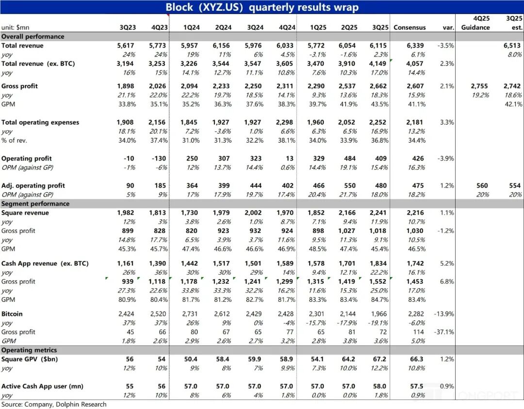 美国支付垂类小龙头-Block于 11 月 7 日早美股盘后,发布了 2025 年 3 季度财报,整体来看本季业绩表现并不差,剔除比特币交易业务后的核心营收,以 及调整后净利润都是好于预期的。 对下季指引也基本符合预期,业绩上并没有特别大的缺陷,股价的大跌更多还是由于宏观市场的原因,核心要点如下: 1、核心营收和利润实际都小超预期:本季度 Block 剔除比特币后的核心营收同比增长 17%,较上季度明显提速 7pct,好于预期。 盈利层面,按公司披露的调整后经营利润为 4.8 亿,同比增长 8%,同样比预期稍好些。要说问题,就是利润增速较收入增速是收窄的,没能起到经营杠 杆的作用。 2、Square 业务加速增长,经营杠杆没体现:核心指标 Square GPV 本季同比增速达 12%,在上季度已明显加速的基础上继续环增了 2pct,增长势头良 好。其中,海外地区是主要拉动因素,GPV 增速更高达 26%,已占整体的 21%。美国市场虽然绝对增速更低为 9%,但也在环比提速(1.9pct)。 不过也正由于收入结构的变化(海外比重和大商家比重都在走高),本季度支付变现率继续走低(环比下降 0.02pct),导致核 ...