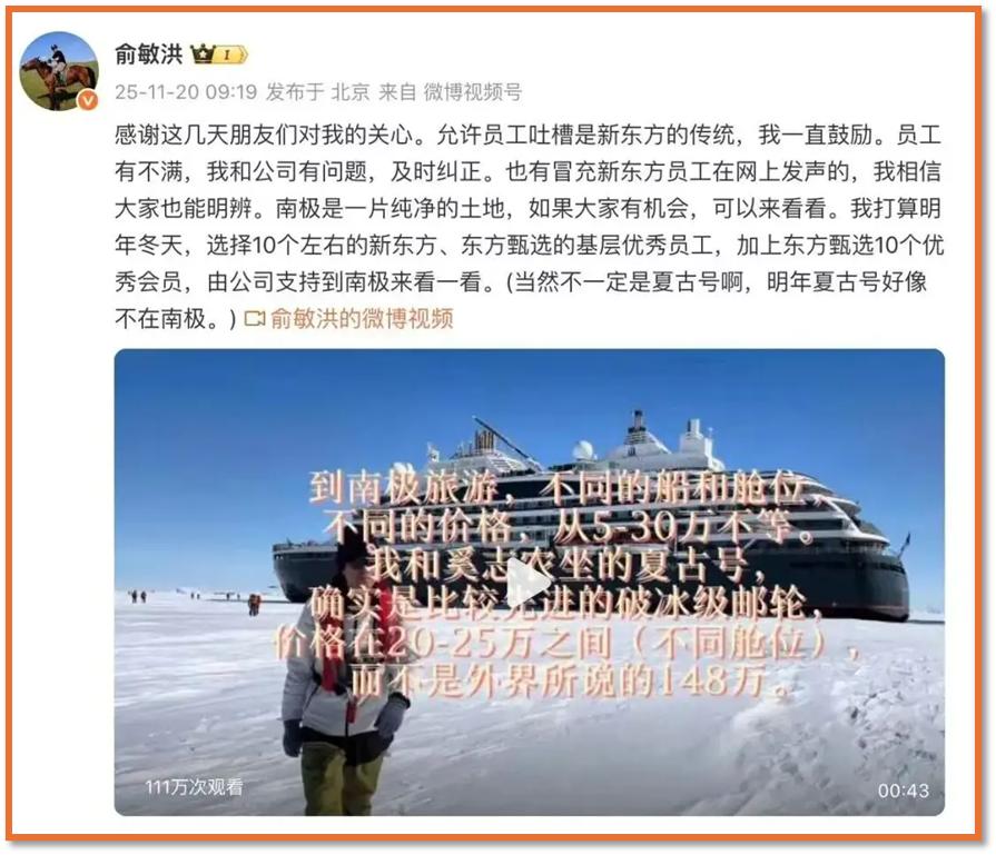 "老板在南极,员工在加班。"这是不少网友在看到俞敏洪的最新全员信后的第一反应。11月20日上午,新东方董事长俞敏洪在社交平台发文回应此前在南 极发布全员信被吐槽。 俞敏洪表示,"允许员工吐槽是新东方的传统,我一直鼓励。员工有不满,我和公司有问题,及时纠正。也有冒充新东方员工在网上发声的,我相信大家 也能明辨。南极是一片纯净的土地,如果大家有机会,可以来看看。我打算明年冬天,选择10个左右的新东方、东方甄选的基层优秀员工,加上东方甄选 10个优秀会员,由公司支持到南极来看一看。" 俞敏洪称,到南极旅游,不同的船和舱位,不同的价格,从5万到30万不等。"我和奚志农坐的夏古号,确实是比较先进的破冰级邮轮,价格在20-25万之 间(不同舱位),而不是外界所说的148万。" 有网友评论称,曾经去新东方上课,最大的好处就是课堂上老师们的各种调侃。 此前报道 11月16日,新东方迎来成立32周年纪念日,创始人俞敏洪身处南极发布内部信,向全体员工及支持者致谢。他在信中以"冰雪中的坚守"为主题回顾创业历 程并擘画未来。同时他在信中提出,新东方要成为"希望的播种者",东方甄选应成"商家良知的代表",新东方文旅要"让更多的人把世界 ...