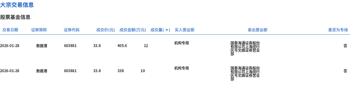 1月28日,数据港大宗交易成交22万股,成交额743.6万元,占当日总成交额的0.3%,成交价33.8元,较 市场收盘价36.82元折价8.2%。 | 交易日期 | 证券简称 | 证券代码 | | | 成交价(元) 成交金额(万元) 成交量( *) 买入营业部 | | 类出营业部 | 是否为专场 | | | --- | --- | --- | --- | --- | --- | --- | --- | --- | --- | | 2026-01-28 | 数据港 | 603881 | 33.8 | 405.6 | 12 | 机构专用 | DECRESSO | | KA | | 2026-01-28 | 数据港 | 603881 | 33.8 | 338 | 10 | 机构专用 | 100 | | Ka | ...