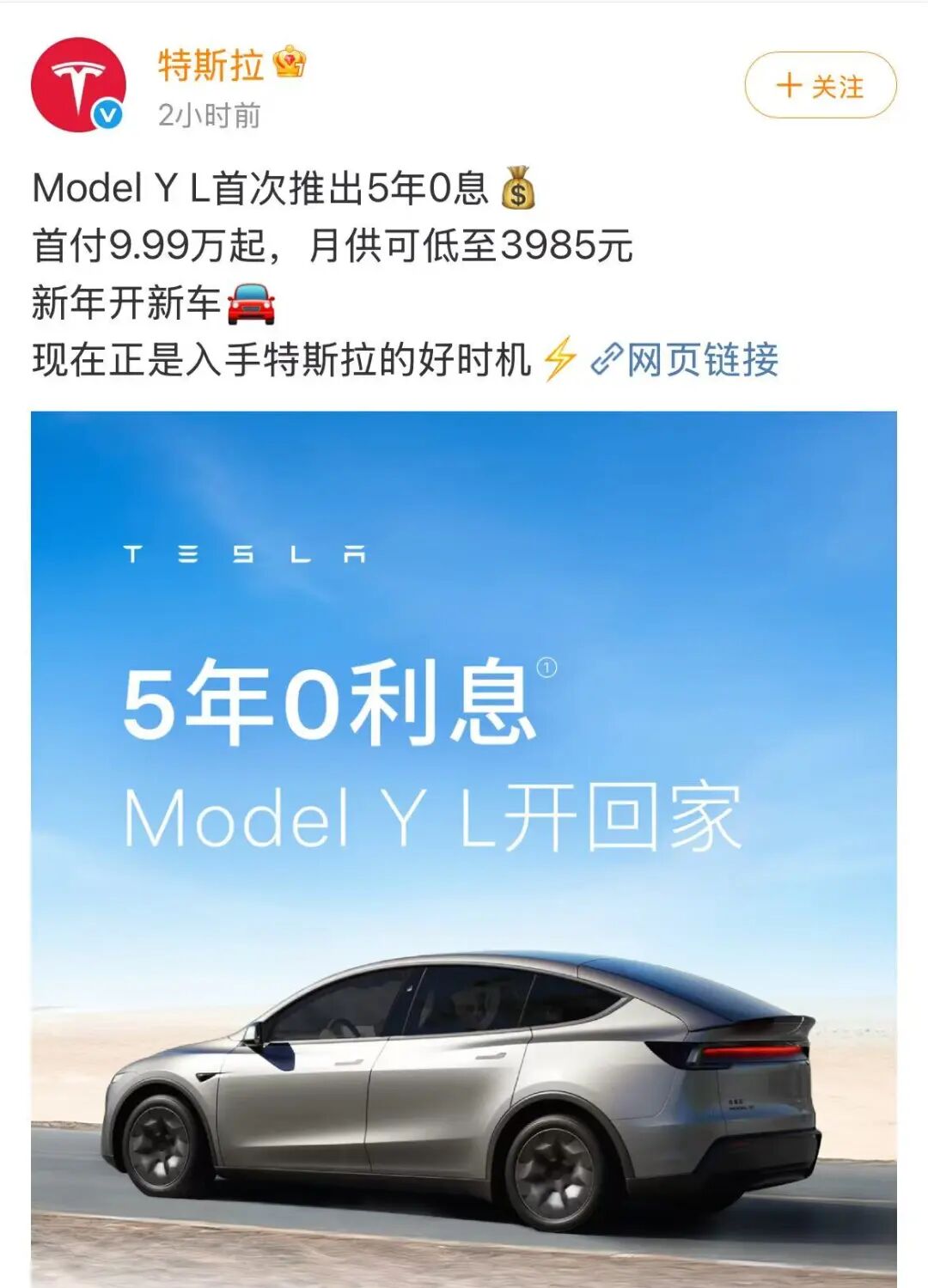 【 导读 】特斯拉中国推出限时金融特惠方案 中国基金报记者 忆山 1月6日,特斯拉中国宣布推出限时金融特惠方案。 7年超低息、5年0息 具体来看,即日起至1月31日,Model3、Y、Y L车型可选择7年超低息购车方案,年费率低 至0.5%,折合年化利率为0.98%。 其中,Model 3、Y首付7.99万元起,月供可低至1918元;Model Y L首付9.99万元起,月 供可低至2947元。 此外,1月31日前下单上述车型,也可选择5年0息方案。其中,Model Y L为首次推出5年0 息,首付9.99万元起,月供可低至3985元。 值得注意的是,当前国内市场车贷年限以3年期(36期)为主流,整体区间为1~5年,部分 豪车品牌或优质客户可放宽 到 6~7年 。不过, 限制条件 基本 较多,年利率也基本超过 3%。 对此,不少网友直言"厉害""挺划算的",还有网友戏称"还完贷款,上小学的孩子开始上大学 了"。 2025年销量首次被比亚迪超越 去年以来,为了刺激销量,特斯拉中国曾多次降价。其中,Model S、X单轮最大降幅达10万 元,Model 3后轮驱动版(焕新版)起售价也降至23.19万元的低位。 从 ...