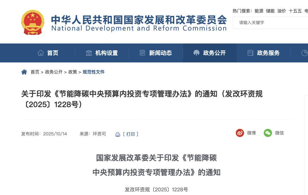 国家发改委关于印发《节能降碳中央预算内投资专项管理办法》的通知(发改环资规〔2025〕1228号)