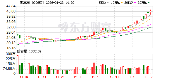 两融数据显示,该股最新(1月22日)两融余额为22.40亿元,其中,融资余额为22.25亿元,近10日增加 3.66亿元,环比增长19.68%。 中钨高新股价再创历史新高,该股近期呈不断突破新高之势,近一个月累计有13个交易日股价刷新历史 纪录。截至13:59,该股目前上涨4.63%,股价报44.48元,成交9958.83万股,成交金额42.02亿元,换手 率6.85%,该股最新A股总市值达1013.52亿元,该股A股流通市值646.26亿元。 证券时报·数据宝统计显示,中钨高新所属的有色金属行业,目前整体涨幅为3.10%,行业内,目前股价 上涨的有127只,涨停的有锌业股份、豫光金铅等7只。股价下跌的有13只,跌幅居前的有铂科新材、图 南股份、龙磁科技等,跌幅分别为3.73%、3.12%、2.64%。 公司发布的三季报数据显示,前三季度公司共实现营业收入127.55亿元,同比增长13.39%,实现净利润 8.46亿元,同比增长18.26%,基本每股收益为0.3821元,加权平均净资产收益率9.51%。(数据宝) (文章来源:证券时报网) ...