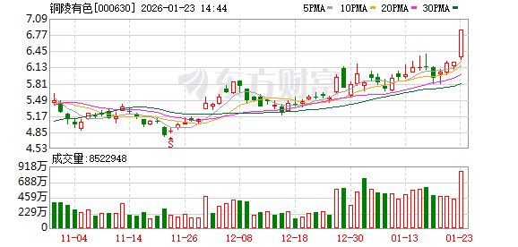 数据宝统计,截至14:10,铜陵有色成交额51.31亿元,创2021年9月15日以来新高。最新股价上涨 9.94%,换手率6.97%。上一交易日该股全天成交额为27.08亿元。 据天眼查APP显示,铜陵有色金属集团股份有限公司成立于1996年11月12日,注册资本1340947.151万 人民币。(数据宝) (文章来源:证券时报网) ...