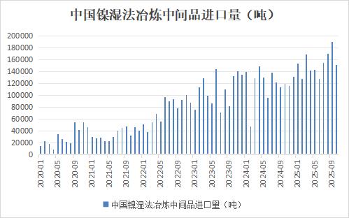 数据来源:海关总署 据中国海关数据统计,2025年10月中国镍湿法中间品进口量15.13万吨,环比减少3.93万吨,降幅 20.62%;同比增加3.17万吨,增幅26.52%。其中自印度尼西亚进口量为13.38万吨,环比减少17.01%, 占本月进口量的88.45%。2025年1-10月镍湿法冶炼中间品进口总量153.04万吨,同比增加29.14%。10月 中国镍湿法中间品进口量明显下降,但仍处于高位。 ...