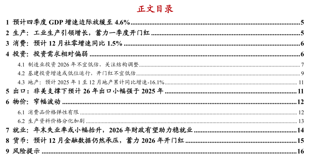 Economic Overview - The GDP growth rate for Q4 2025 is expected to slow to 4.6%, with a strong production sector and moderate demand recovery [1][14] - Industrial production is projected to maintain steady growth, significantly supporting the overall GDP growth target [2][15] - External demand remains resilient, with export growth expected to continue positively [1][5] Production - The industrial added value growth rate for December is estimated at 5.0%, with an annual growth rate of 5.9% for 2025, significantly higher than GDP growth [2][15] - Improvement in demand is noted, driven by pre-holiday inventory buildup and construction progress [2][16] - Manufacturing enterprises are experiencing improved production and market demand, with production growth slightly outpacing demand [2][16] Consumption - The retail sales growth rate for December is expected to be 1.5%, a slight increase from 1.3% [3][19] - Policies supporting the replacement of old products are anticipated to bolster consumer spending, particularly in durable goods [3][19] - The automotive sector continues to face challenges with declining sales and increased discounts, impacting overall retail recovery [3][20] Investment - Fixed asset investment for 2025 is projected to decline by 3.3%, with manufacturing investment showing resilience at 1.2% growth, while infrastructure and real estate investments are under pressure [4][23] - The investment environment has been notably weak since June 2025, with a focus on stabilizing growth in 2026 [4][25] - Manufacturing and broad infrastructure investments are expected to jointly drive growth in early 2026, with a projected increase of 2.5% for the year [4][25][30] Export - December export growth is anticipated at 3.9%, with an annual growth rate of 6.6% for 2026, supported by stable external demand from non-developed countries [5][5] - The stabilization of US-China trade relations and reduced trade friction with Europe and Japan are expected to benefit exports [5][5] Prices - The Consumer Price Index (CPI) growth rate for December is expected to be 0.7%, while the Producer Price Index (PPI) is projected at -1.9% [6][6] - The overall price level is expected to remain stable, with core CPI showing signs of recovery [6][6] Employment - The urban unemployment rate for December is projected to rise slightly to 5.2%, influenced by seasonal factors [7][7] - Continued policy support is expected to help stabilize employment, particularly for vulnerable groups [7][7] Monetary Policy - Financial data for December indicates continued pressure, with new loans and social financing expected to decline [8][8] - The central economic work conference emphasizes the need for flexible monetary policy to support economic stability and reasonable price recovery [8][8]