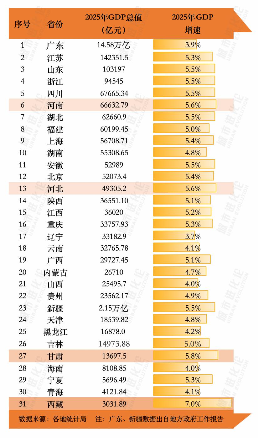 随着江苏公布2025年经济数据,全国31个省份2025年经济"成绩单"全部出炉。在GDP总量方面,广东、江苏、山东跻 身"10万亿俱乐部",浙江、四川、河南、湖北、福建、上海、湖南紧随其后,排在全国第四名至第十名,生产总值均 超5万亿元。 | | 省份 | 2025年GDP总值 | 2025年GDP | | --- | --- | --- | --- | | | | (亿元) | 増速 | | 16 | 广东 | 14.58万亿 | 3.9% | | 2 5 | 江苏 | 142351.5 | 5.3% | | 3 | 山东 | 103197 | 5.5% | | 4 | 浙江 | 94545 | 5.5% | | 5 | 四川 | 67665.34 | 5.5% | | 6 | 河南 | 66632.79 | 5.6% | | 7 | 湖北 | 62660.9 | 5.5% | | 8 | 福建 | 60199.45 | 5.0% | | 9 | 上海 | 56708.71 | 5.4% | | 10 | 湖南 | 55308.65 | 4.8% | | 11 | 安徽 | 52989 | 5.5% | | ...