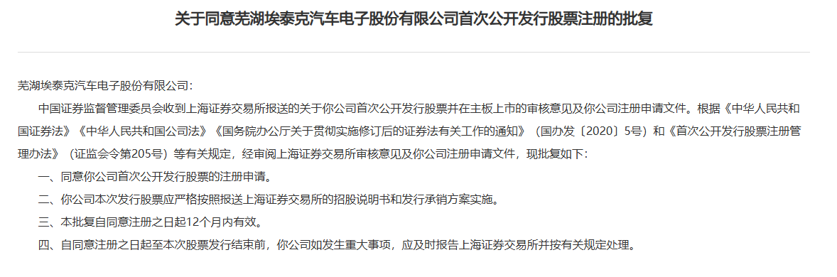 中国证监会同意芜湖埃泰克汽车电子股份有限公司首次公开发行股票注册